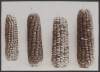 Foto van vier maïskolven met gladde, rimpelige en beide soorten korrels, resultaat van een kruising van suikerhoudende maïs en zetmeelhoudende maïs, 1899